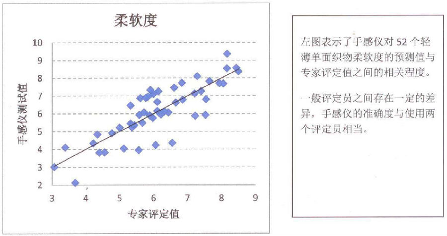 研究人员通过使用一组经验丰富的手感评定专家来校对织物手感仪,达到了能够准确预测评定人员对织物的光滑度、柔软度、凉爽度、干爽度、毛绒度、松紧度以及轻重感的评定值,特别是对轻薄型单面针织物有很好的重复性。